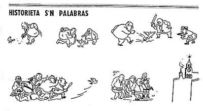 Hemos de confesar, dice el Noticiario Universal, falangista, que a nosotros no nos hace gracia esta gracia de hoy, por lo que tiene de pedestre y hasta de subversiva. Cuando no se tiene el valor de dar la cara, nada mejor que lanzar un chiste al arroyo con la energía atómica que el vertedor necesita para hacer daño sin aparecer como delincuente. [96]