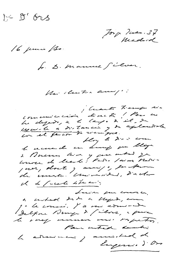 Correspondencia recibida por Manuel Gálvez, depositada en la Academia Argentina de Letras. (Selección)Eugenio D'Ors, 16 de junio de 1930(?) |